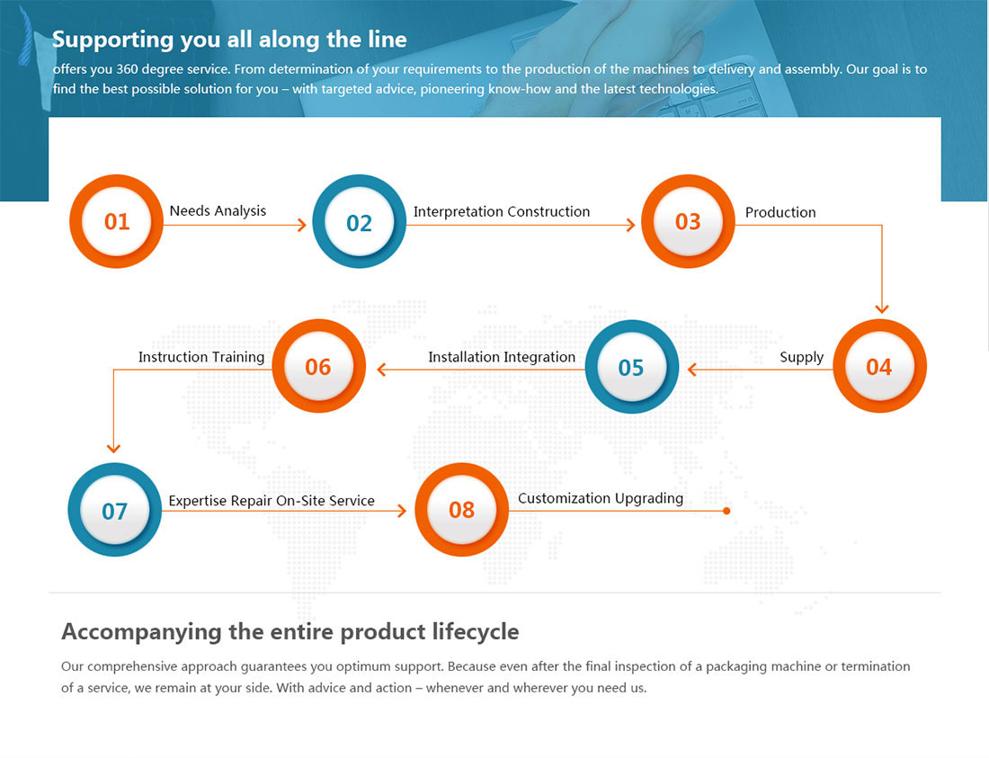 我們?nèi)娴姆椒ūWC您獲得更好的售后支持 因?yàn)榧词乖谧罱K檢查包裝機(jī)或終止服務(wù)之后,我們?nèi)匀辉谀磉叀?通過建議和行動(dòng) - 無論何時(shí)何地,只要您需要我們。